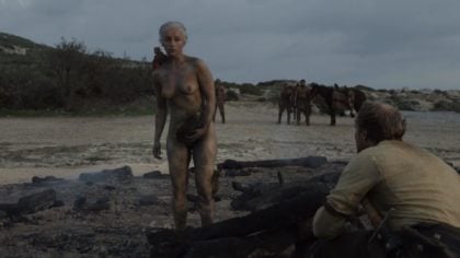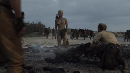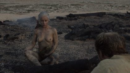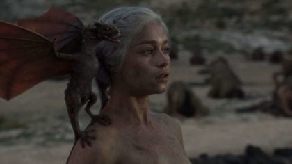 It’s a bit of a shame that one of these dragons was used to block Daenerys’ pussy – was that really important? She’s just survived a fire without a single blemish and gave birth to dragons: I don’t think modesty is exactly the primary concern! As an aside to this, my fan theory isn’t that everyone started to bow down because she’s the mother of dragons: they did it just to praise those great, perky tits. I’d be down on my knees too, although I’d likely keep my vision front and center in case someone came along with some clothes for her to wear.