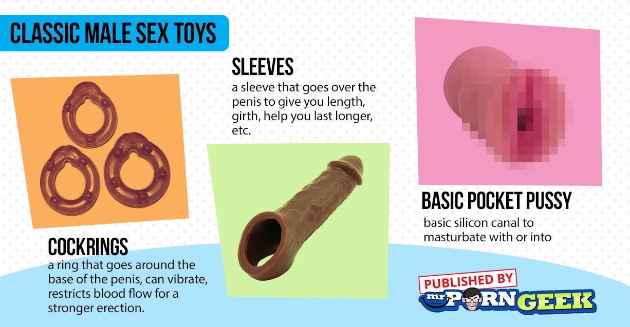- Sleeves: a sleeve that goes over the penis to give you length, girth, help you last longer, etc.