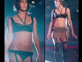 Last but not least in “We’re the Millers’ Jennifer plays a stripper that has to pretend to be a goodie-goodie mom. She wears sexy lingerie in her strip joint a hot a little wig that makes her look like a naughty slut. She dances and moves like a woman who knows how to ride a cock good. In one scene Jennifer Aniston pretty much has a nip slip. She is in a little see-through bra and her nipples can be seen completely. They are hard and her tits are perky so of course when you watch it your dick perks up too!