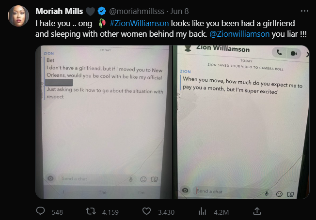 Pornstar Moriah Mills Exposes Zion Williamson’s Cheating