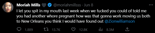 Now usually in these situations, I’d go ahead and just embed the Tweets – but they might end up deleted, so I’m going to screenshot and link instead. Believe Mr. Porn Geek though: these are legitimate Tweets from Moriah Mills talking smack about Zion and what he’s been doing. She’s a badass bitch who’s going to war, that’s for damn sure.