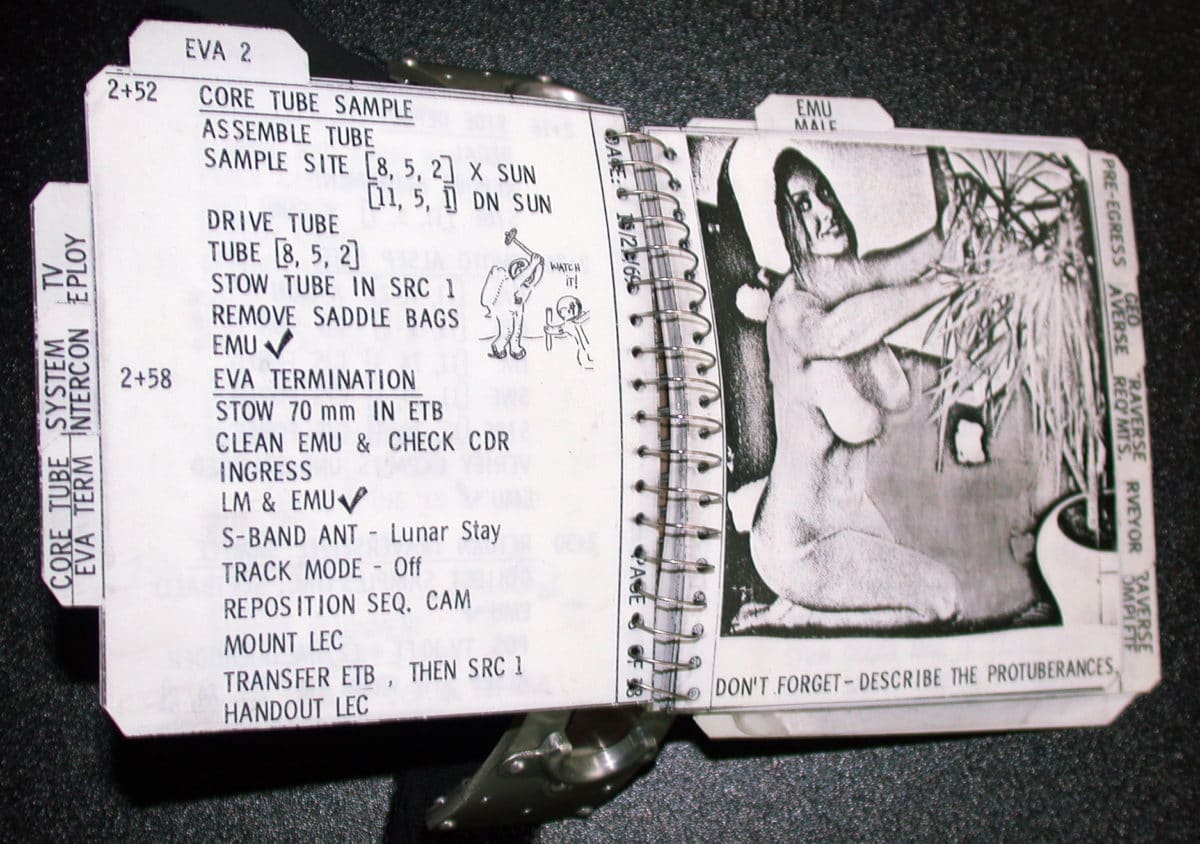 I know – it’s crazy – but absolutely true! Dave Scott, the backup commander to the Apollo 12 mission, decided that his time as a secondary choice for the adventure into space was best spent providing the men that would land on the Moon with access to some sexy babes. See, on the arm of every suit the astronauts wore was a small flipbook detailing what was expected of them during the mission. It functioned as a checklist of sorts and would ensure that they were on time and on schedule for everything they needed to do.