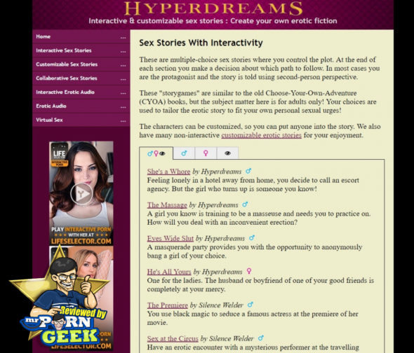 I’m sure that if you’ve read my reviews here on Mr. Porn Geek for any length of time, you’ll know that I love nothing more than a good old piece of text about pornography. I took a look at a site called HyperDreams today and let me tell you, when it comes to getting that classic dose of erotica with a fresh, personalized twist: look no further. The concept here is one of making the reading of erotic literature that much easier, because the site provides you with the ability to enjoy both interactive and customizable porn stories tailor-made toward your requirements.